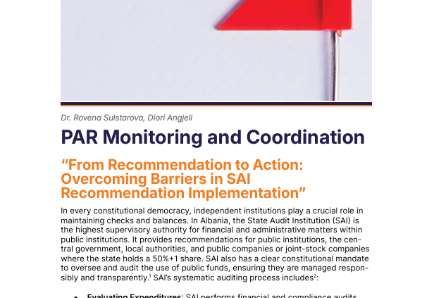 In every constitutional democracy, independent institutions play a crucial role in maintaining checks and balances. In Albania, the State Audit Institution (SAI) is the highest supervisory authority for financial and administrative matters within public institutions. It provides recommendations for public institutions, the central government, local authorities, and public companies or joint-stock companies where the state holds a 50%+1 share. SAI also has a clear constitutional mandate to oversee and audit the use of public funds, ensuring they are managed responsibly and transparently.