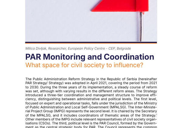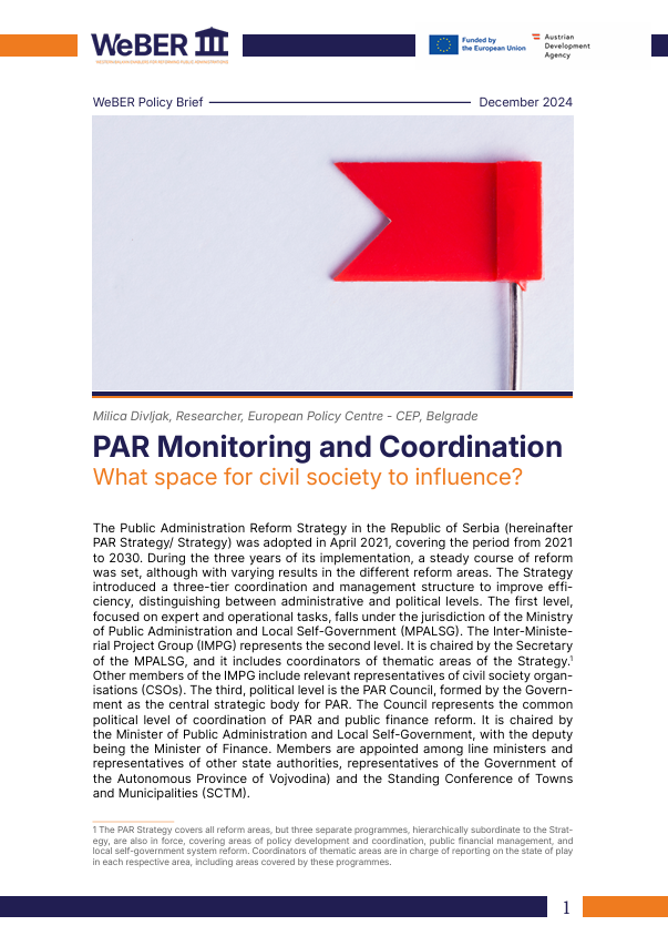 The Public Administration Reform Strategy in the Republic of Serbia (hereinafter PAR Strategy/ Strategy) was adopted in April 2021, covering the period from 2021 to 2030. During the three years of its implementation, a steady course of reform was set, although with varying results in the different reform areas. The Strategy introduced a three-tier coordination and management structure to improve efficiency, distinguishing between administrative and political levels. The first level, focused on expert and operational tasks, falls under the jurisdiction of the Ministry of Public Administration and Local Self-Government (MPALSG). The Inter-Ministerial Project Group (IMPG) represents the second level. It is chaired by the Secretary of the MPALSG, and it includes coordinators of thematic areas of the Strategy. Other members of the IMPG include relevant representatives of civil society organisations (CSOs). The third, political level is the PAR Council, formed by the Government as the central strategic body for PAR. The Council represents the common political level of coordination of PAR and public finance reform. It is chaired by the Minister of Public Administration and Local Self-Government, with the deputy being the Minister of Finance. Members are appointed among line ministers and representatives of other state authorities, representatives of the Government of the Autonomous Province of Vojvodina) and the Standing Conference of Towns and Municipalities (SCTM).